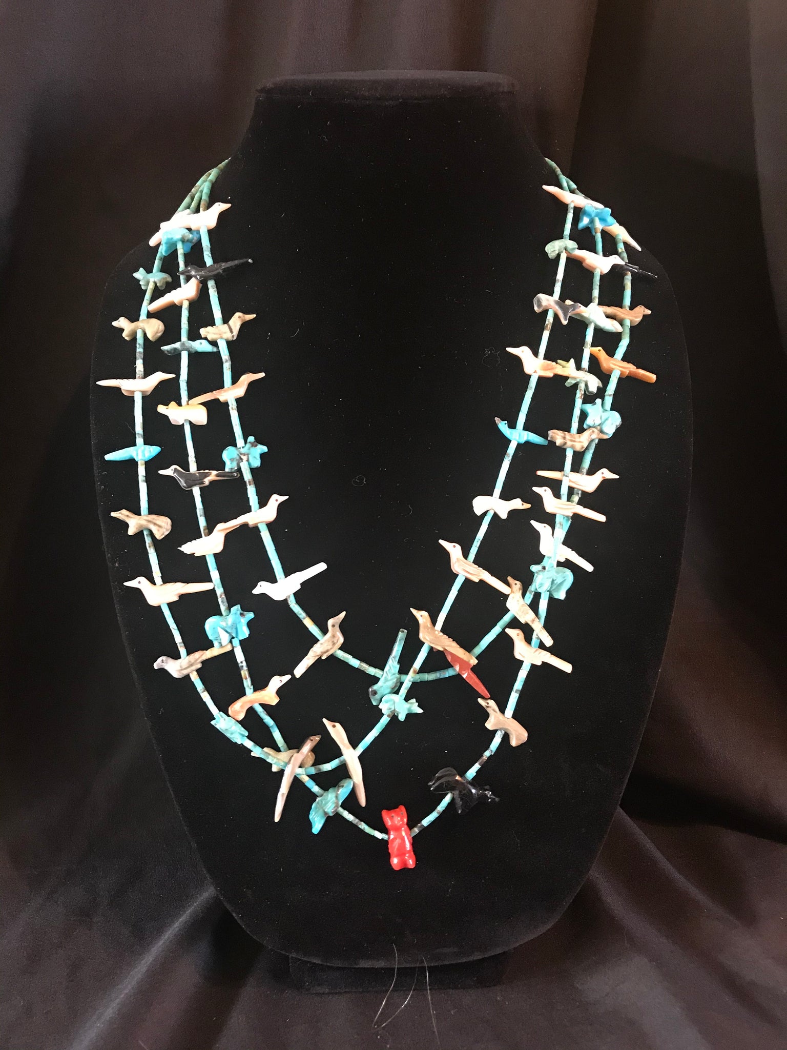 This 3 strand necklace is made from rolled turquoise beads with animal and bird carved fetishes.  Animals are Zuni, however treated turquoise fetishes are of differing artist.