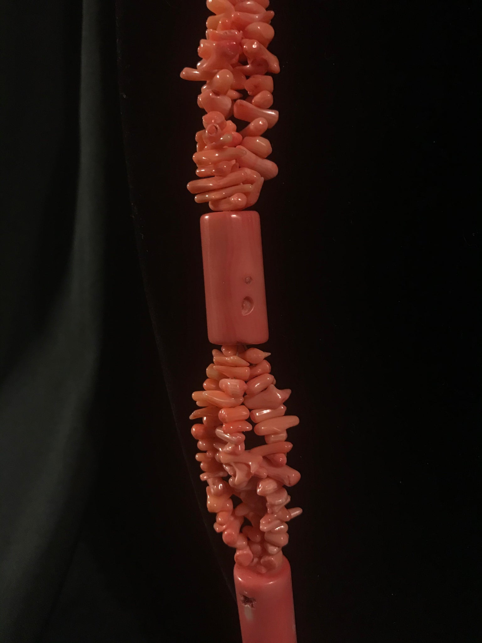 Single strand of large dyed Asian coral cylinder beads; probably bamboo
