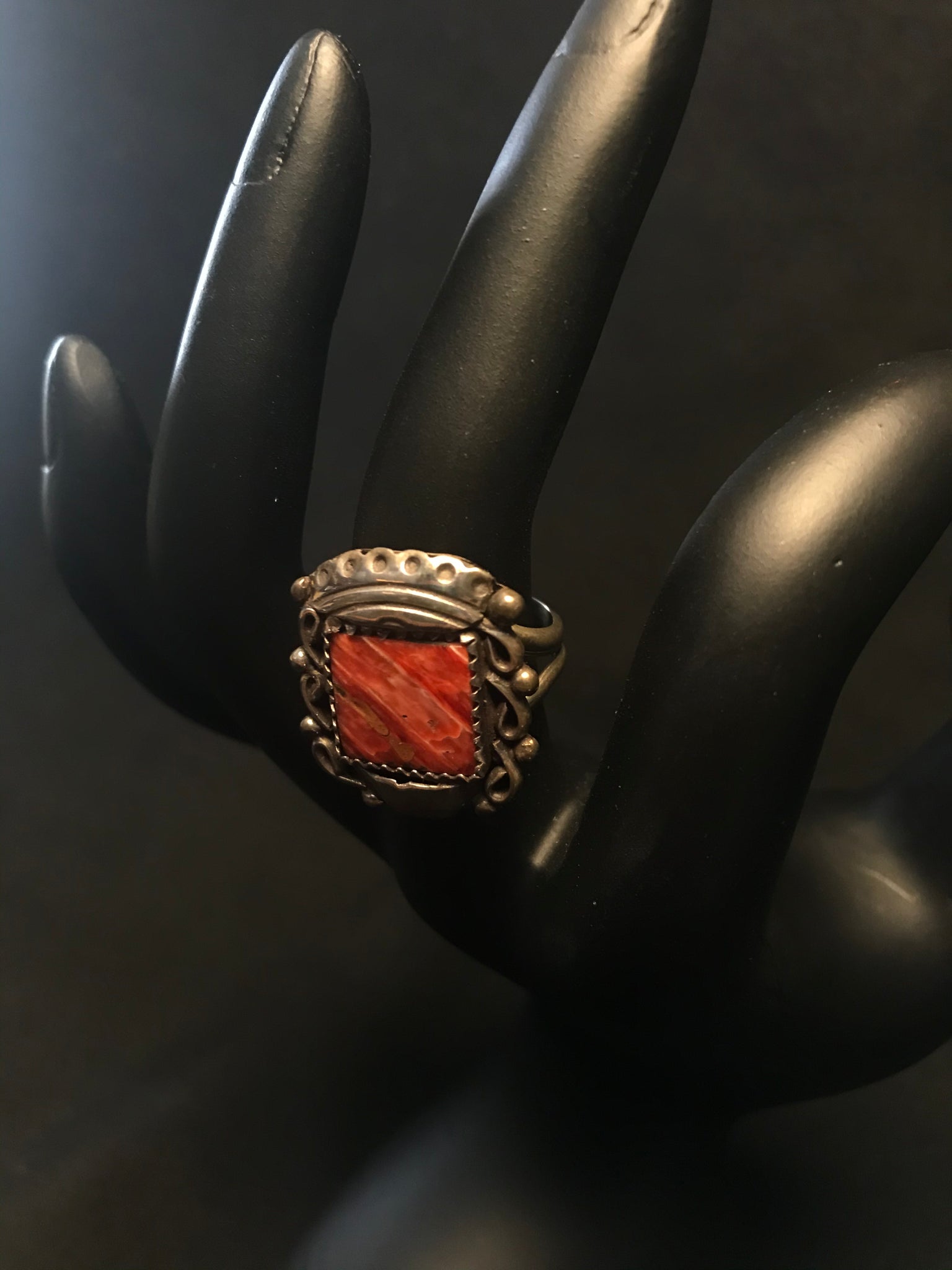 Navajo Large square red stone set in silver-like metal with small loop and dot overlays and stamped design at top of ring, sized 6.5