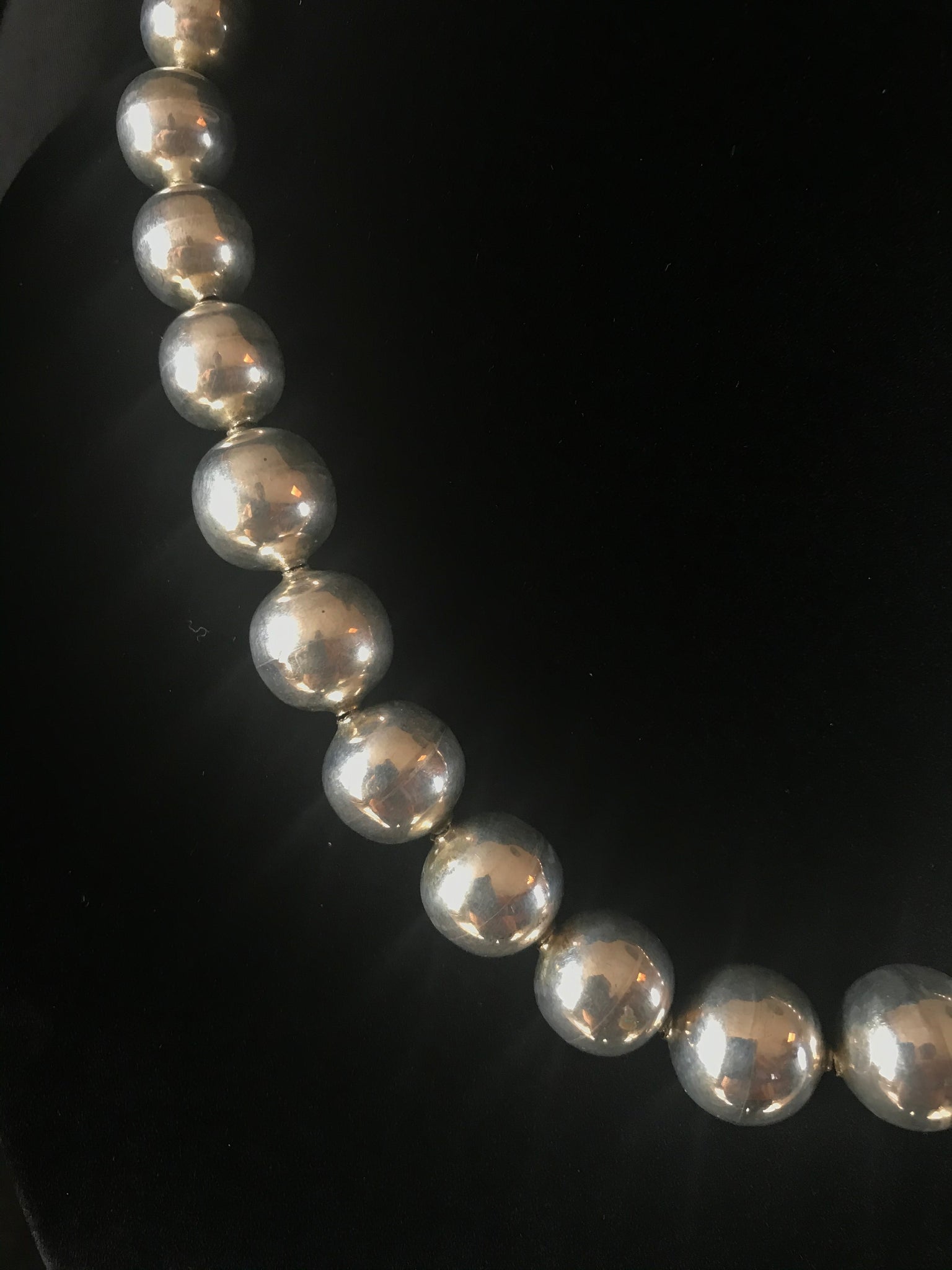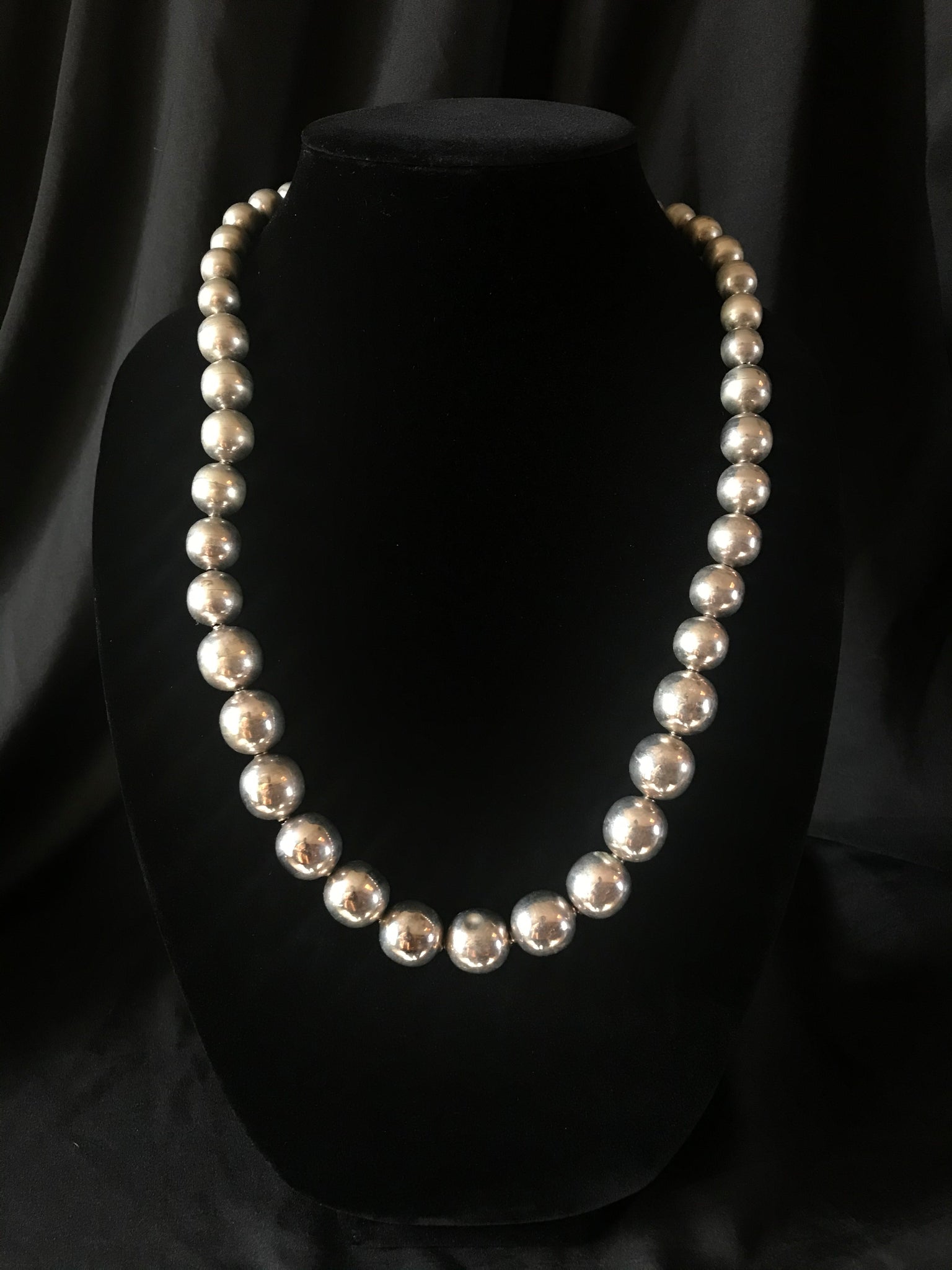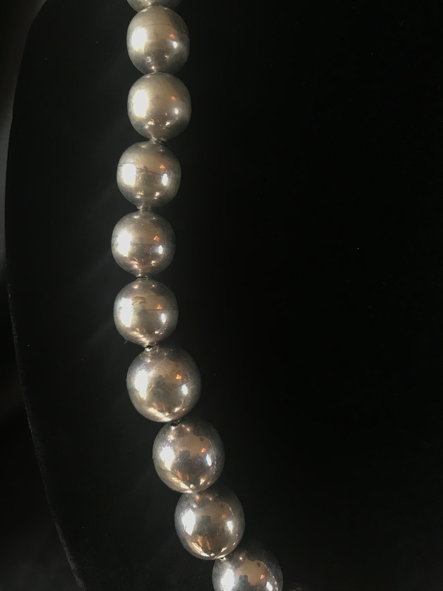 1 strand necklace of fairly large size Alpaca "silver"  beads from Mexico.  NOTE:  Alpaca is NOT silver but is an alloy of copper, nickel, and sometimes zinc or iron.  Necklace is 25".  This necklace needs a deep cleaning.