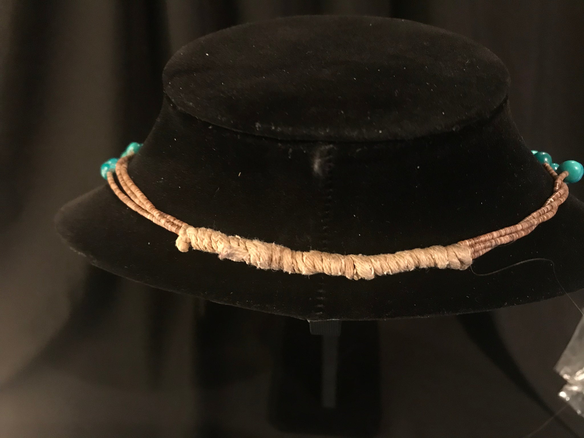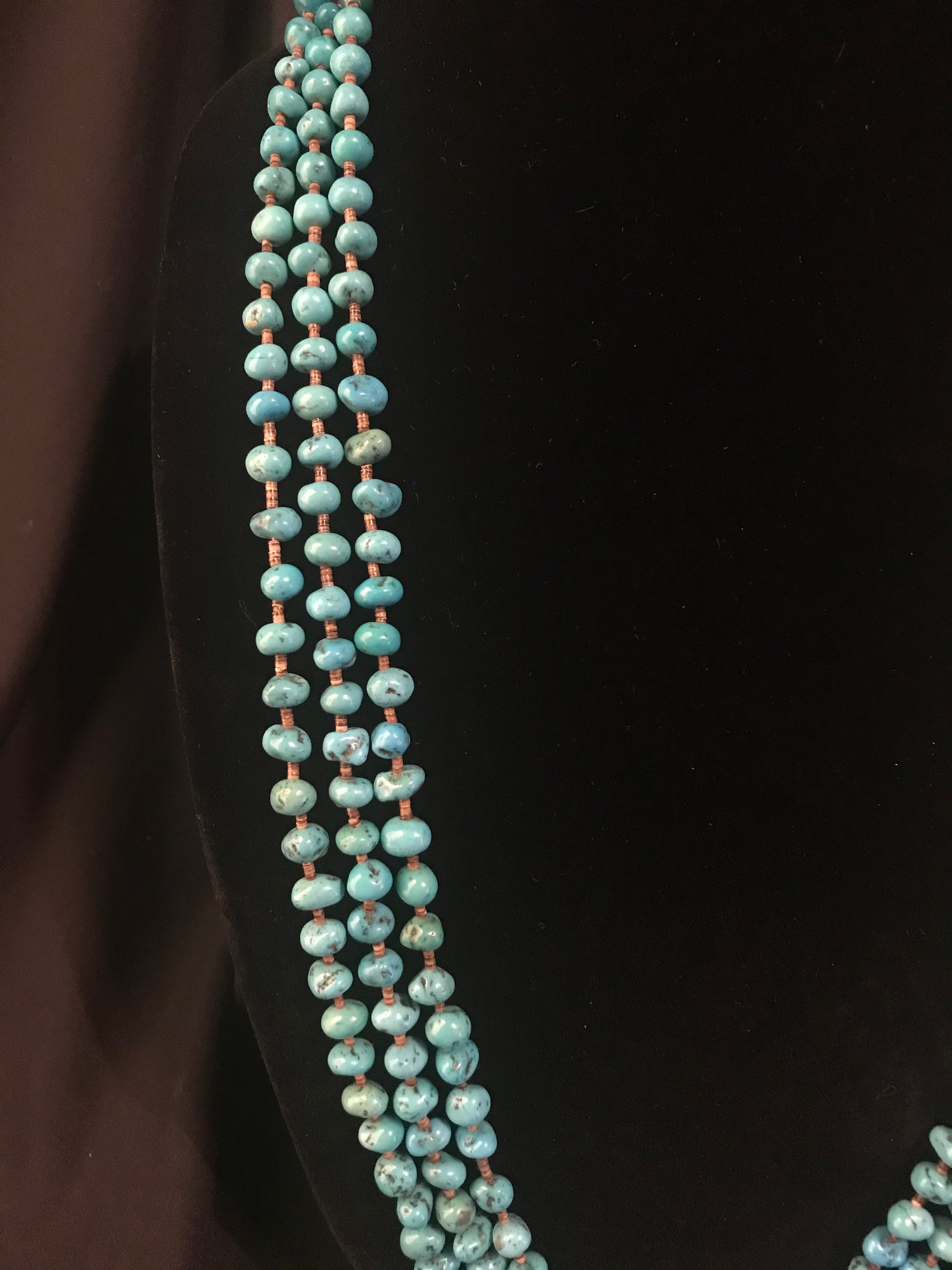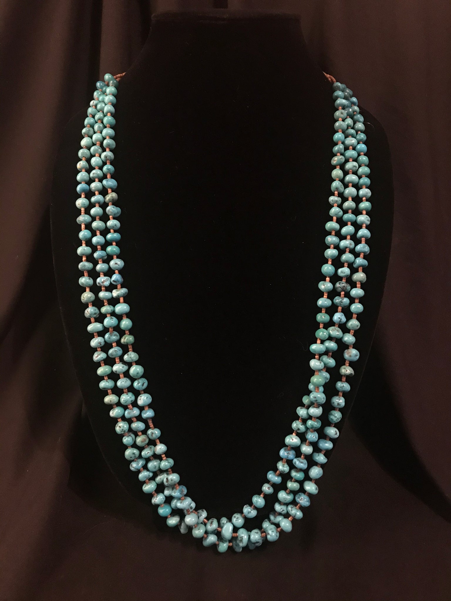 3 strand necklace of olive heishi beads with tumbled treated turquoise nuggets,