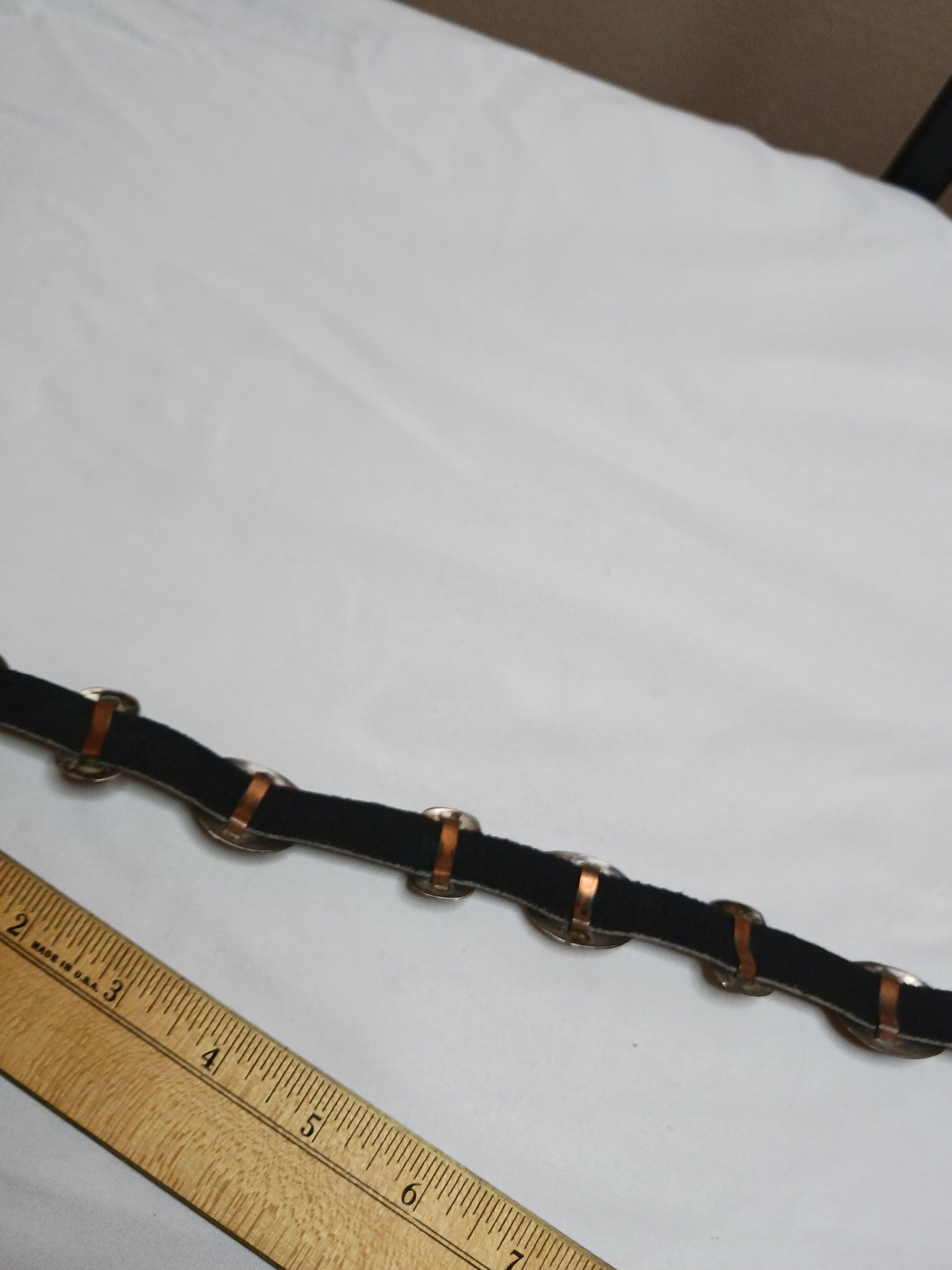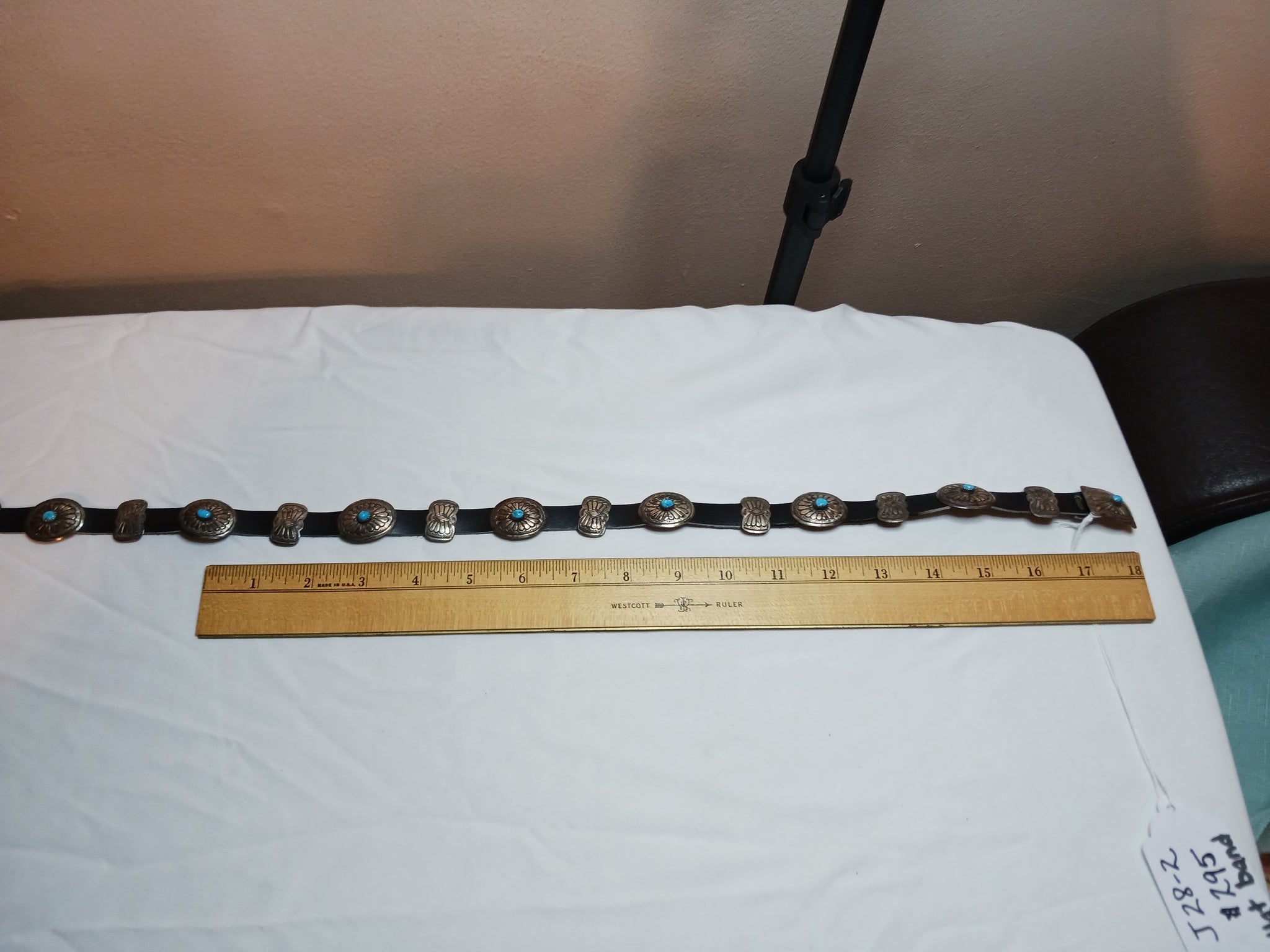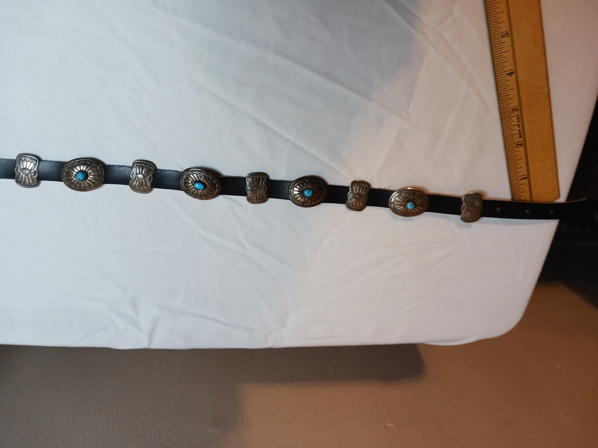 Small Navajo concho belt or hand band; 31" band; 8 conchos plus buckle plus 9 separators; signed by artist