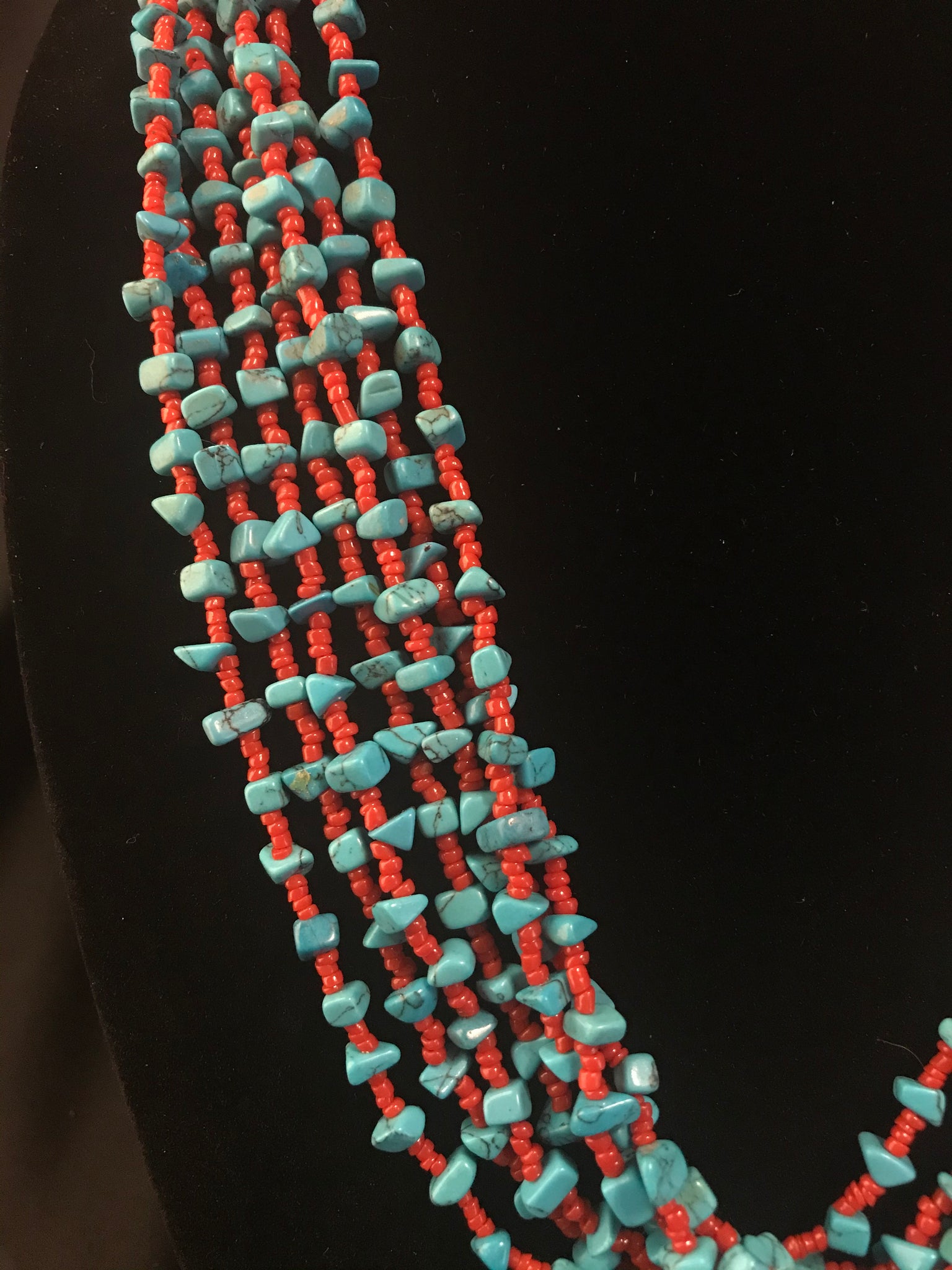 7 strand necklace of small red glass beads with chips of coral