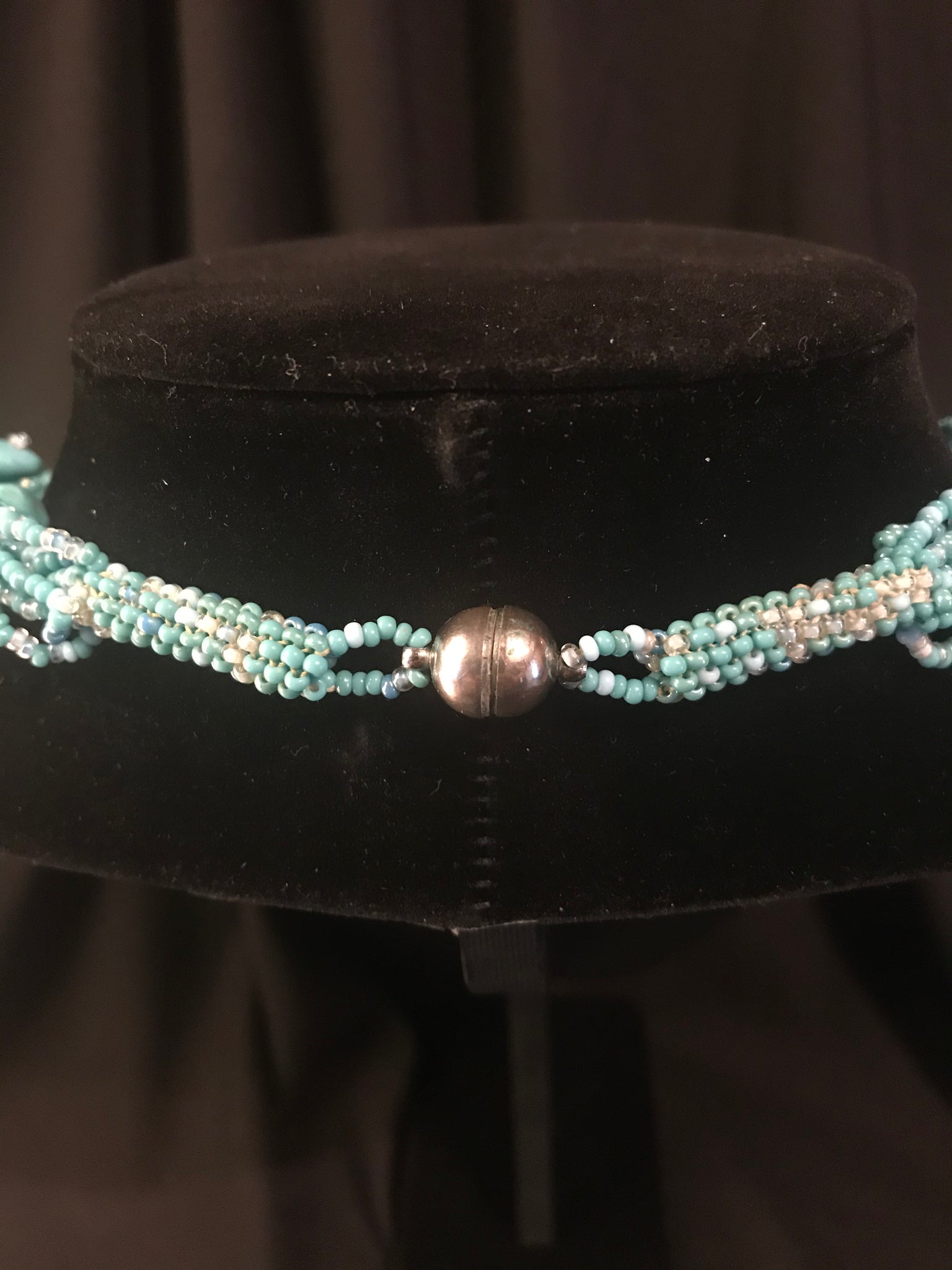 Multi-strand necklace of pale blue glass beads with block tabs; treasure-style;