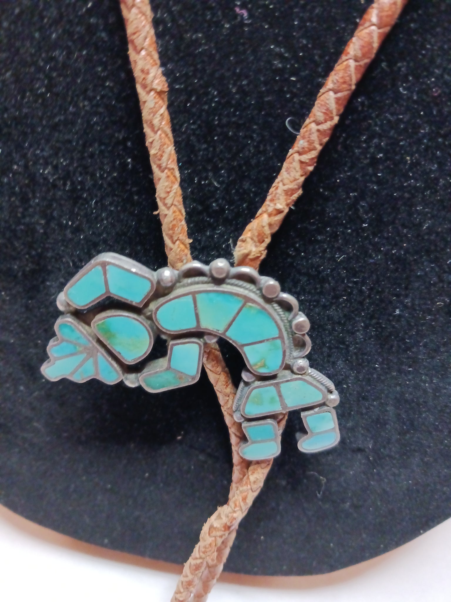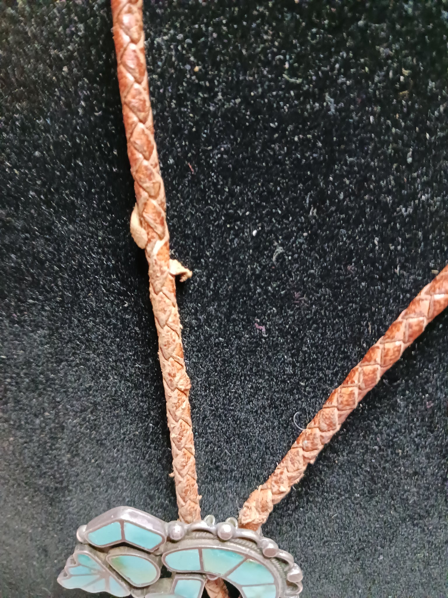 Zuni rainbow man bolo with turquoise inlay.   Brown rope is somewhat frayed and probably should be replaced.